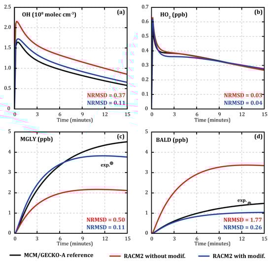 Comparisons showed a higher OH concentration and, therefore, greater toluene degradation with RACM2 than with MCM/GECKO-A despite identical gaseous inorganic chemistry and conditions. Figure 1 shows the evolution of the concentrations of OH (Figure 1a), HO2 (Figure 1b), methylglyoxal (MGLY, Figure 1c), and aromatic aldehydes (BALD, Figure 1d) during the MCM/GECKO-A (black) and RACM2 (red) simulations at 7 °C with 120 ppb of IPN and 112 ppb of toluene as input. Normalized root mean square deviation (NRMSD) was calculated for each species as follows: