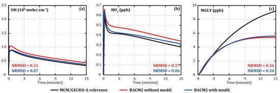 The xylene oxidation mechanism in RACM2 was quite similar to that of toluene, in particular, with the reformation of part of the OH from the first oxidation step. In addition, certain species affected by the modifications were part of the xylene mechanism (i.e., EPX, DCB1, and DCB2). The same deterministic/simplified comparison method was therefore applied to xylenes to modify their mechanism in RACM2. In addition to the reactions initially modified for toluene, four reactions were modified to suppress the reformation of OH from the first oxidation step (R162 to R165, see Table 3). Figure 2 shows the evolution of the concentrations of OH (Figure 2a), HO2 (Figure 2b), and methylglyoxal (MGLY, Figure 2c) during o-xylene oxidation with MCM/GECKO-A (black), original RACM2 (red) (Appendix A), and modified RACM2 (blue) under similar conditions compared with toluene oxidation (7 °C, 120 ppb of IPN, and 112 ppb of o-xylene as input). The modifications made in the RACM2 xylene mechanism improved the evolution of OH and HO2 concentrations, reducing NRMSD from 0.21 to 0.07 and from 0.17 to 0.06, respectively (see Figure 2a,b), without degrading the evolutions of the NOX. Methylglyoxal concentrations were not significantly modified (NRMSD from 0.36 to 0.34, see Figure 2c).