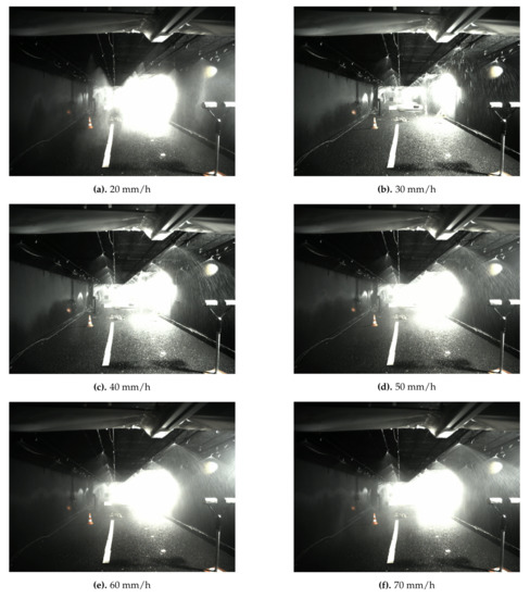 Images taken by the visible camera at each generated rain rate are presented in Figure 10. The images allow us to witness the evolution of visual degradation along with increasing precipitation intensity in mm/h as well as properties of the artificial rain (size of droplets, spatial distribution, spray profile)—yet one should carefully interpret these images, as they have been acquired with the camera automatic parameter control. As opposed to Figure 4, taken in clear conditions, the light spots in rainy conditions cause glare effects, caused by the scattering of light by water droplets. Comparing Figure 10a,b, one can see that the glare effect is stronger with the 20 mm/h rain rate than with the 30 mm/h one. Indeed, it is possible to see the end of the chamber at the latter while the glare effect from 20 mm/h makes the identification of objects behind target a1, a2 and a3 impossible. The observed glare effects are unexpected since an increasing rain rate would intuitively result in higher visual degradation.