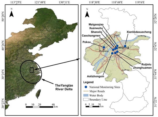 Nanjing, with its 2000 years of history, is the capital of Jiangsu Province and the economic hub of the Yangtze River Delta. Nanjing is one of the most important and rapidly developing cities in China, with a large population and well-developed industry and manufacturing sectors []. In recent years, Nanjing has been faced with extreme and severe air pollution owing to its rapid economic growth and non-stop energy consumption []. Nanjing lies between the geo-coordinates 31°14′ to 32°37′ and 118°22′ to 119°14′, and occupies an area of approximately 6596 km2 with 11 districts that can be classified into three regions: urban, suburban and rural. Geographically, the city is located within the Yangtze River Delta. As of 2019, the population of Nanjing was approximately 8.34 million with a density of 8500 people/km2 in the central area. The city experiences a subtropical monsoon climate with four distinct seasons. The annual average temperature ranges between 16 °C and 38 °C in the summer and is −8 °C in the winter, and the annual precipitation is approximately 1090 mm []. In China, Nanjing is one of four garden cities with a per capita green area of 13.7 km2, although there are many large areas of industry and enterprise. The leading industries in Nanjing are electronics, automobiles, petrochemicals, and steel smelting. To improve and rectify these polluting sites and enterprises, the administration has taken a number of measures. Additionally, the city is bordered by highlands and mountains on three sides and by water on the other, which can result in the accumulation of air pollutants in urban areas.