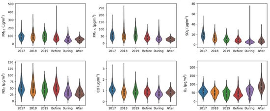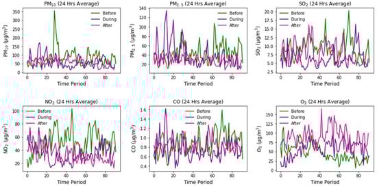 Changes in different pollutants (PM10, PM2.5, SO2, NO2, CO and O3) before, during and after the lockdown periods are shown in Figure 2. Overall, an increasing trend in PM10 was observed before the lockdown phase. During lockdown, a diminishing trend in the concentration of PM10 was observed, and it continued to decrease after the lockdown phase with similar variabilities. The results suggest that the significant reduction in the concentration of PM10 could be due to the limited vehicular, industrial and construction activities. A remarkable reduction in vehicular and transportation activities could also decrease air pollution []. Before the lockdown phase, PM2.5 demonstrated an increasing trend; at first, during lockdown it showed an increasing trend and later decreased, while after lockdown, the concentration of PM2.5 decreased significantly. The results suggest that, overall, during the lockdown phase, PM2.5 showed a constantly decreasing trend.