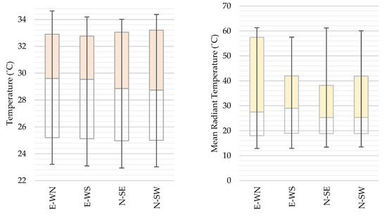 The amount of insolation resulted in the poorest environment nearby the north façade. The highest mean radiant temperature (MRT = 36.25 °C) and the surface temperature (ST = 30.40 °C) were observed. The most favorable conditions appeared at the south façade (MRT = 30.27 °C, ST = 25.70 °C).