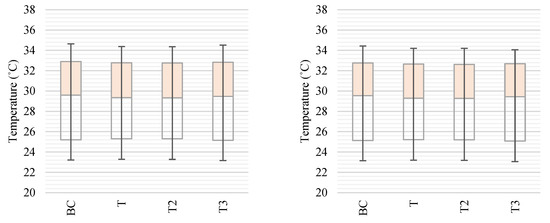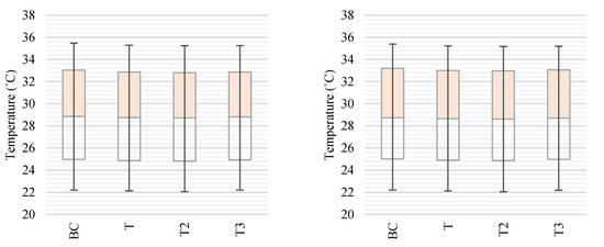 The analyses showed that the microclimatic conditions varied according to the urban structure (Figure 6). Air temperature ranged from 23.21 to 34.64 °C (E-WN), from 23.14 to 34.43 °C (E-WS) in the canyon with an east–west orientation. It was evident that lower parameter values per day were recorded at the south facade (E-WS). The buildings effectively reduced solar radiation, which resulted in more favorable conditions during the period of prevailing high temperatures in the city.