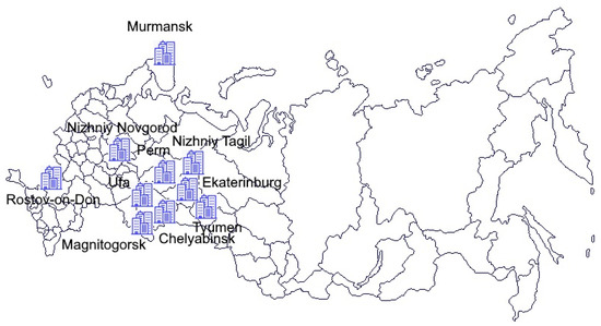 The location of the cities on the map of Russia where the collection of samples of urban surface deposited sediments was performed.