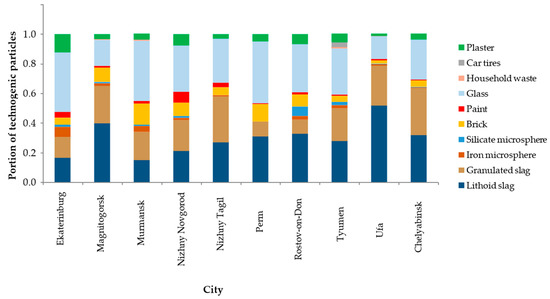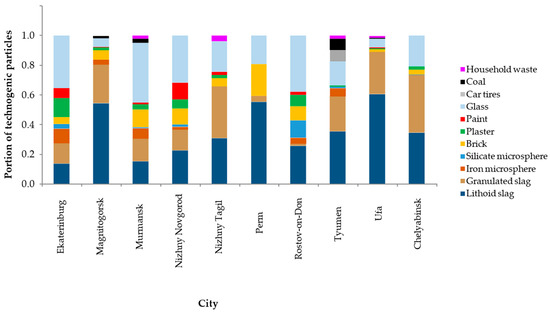 The proportion of technogenic particles differs from city to city. The largest portion of anthropogenic particles in the USDS coarse fraction was found in Rostov-on-Don, Ekaterinburg, Nizhny Novgorod, Nizhny Tagil, and Magnitogorsk. The high proportion of technogenic particles in these four cities is apparently related to the ferrous metallurgy and mechanical engineering industries. The city of Rostov-on-Don is the most southern of the surveyed cities. According to previous studies, the city has the highest accumulation of dust and USDS due to the arid climate and bad cleaning and management of the urban environment [1,22]. The lower amount of the anthropogenic coarse material was found in Perm and Tyumen. Tyumen is one of the least-polluted cities in Russia, although it has a slightly large number of cars per capita in comparison with other cities [22]. It should be noted that for all cities the proportion of technogenic phase in the combined fraction of 0.1–1 mm will be consistent with the proportions of the anthropogenic material in the separate fractions of 0.1–0.25 and 0.25–1 mm (Figure 4).
