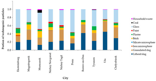 The separate group of the cities of the Ural region with a metallurgical industry (Nizhny Tagil, Chelyabinsk, and Magnitogorsk) can be distinguished among the studied cities. Each city in this group has a large metallurgical plant, coking, and coal power plants. The number of technogenic particles does not differ significantly both in fractions of 0.1–0.25 and 0.25–1 mm separately and in the combined particle size fraction of 0.1–1 mm in these cities. According to the results of previous studies [46], the anthropogenic material in the form of slag is used in such cities as a building material, for example, instead of sand and stone in pavement and road construction in residential areas. There is also a coal power plant in Murmansk. It can be assumed that in the group of four cities, technogenic particles, in particular slag, can enter the USDS material with emissions from power plants and smelters.