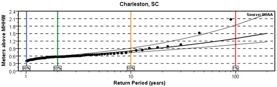 An alternative perspective of this same problem comes from comparing actual surge height relative to the predicted surge height of the model for a specific probability (return rate). The predicted surge frequency of greatest interest in this paper is the 1% surge (the surge with a return rate of 100). Figure 2 presents the surge exceedance figure for Charleston, SC [10]. Similar figures for the other 23 sites are in the Supplementary Materials. The top red line reveals the predicted height of the 100-year surge. Figure 2 shows the same two extreme storms identified in Figure 1. The first surge in 1940 exceeded the 100-year surge by 0.3 m and the second surge in 1989 exceeded the 100-year surge by 0.8 m. Figure 2 shows that the GEV model underpredicts the height of the 100-year surge.