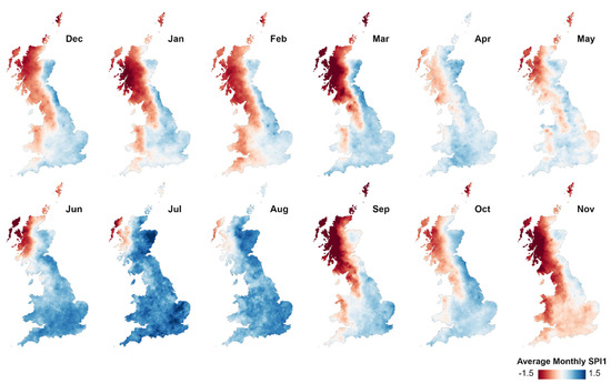 Figure 2 and Figure 3 present the average monthly SPI-1 values under NAO+ and NAO− conditions. Whilst these are average monthly SPI-1 values and mask extreme values, clear spatial and temporal signatures of the NAO can be detected. In the winter months, the NAO rainfall response described in the introduction can be observed [1,7,12,13]. Under NAO+ conditions, the north-west areas have higher/positive average SPI-1 values, indicating wet conditions, and under NAO− conditions, the region is typically dry (negative SPI-1 values). The inverse average wet/dry response, albeit weaker, is seen in the southern and eastern areas.