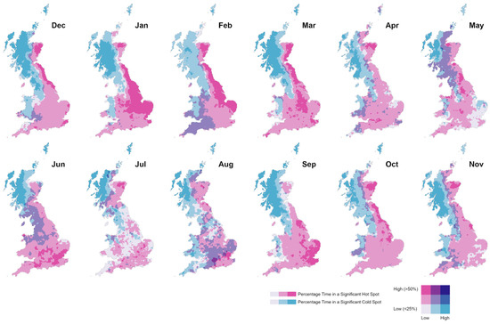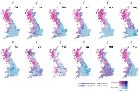 Figure 4 and Figure 5 show the results of the space-time hot spot analysis. This analysis involved calculating the Getis-Ord Gi* for each time step (SPI-1 dataset) of the month/phase space–time cubes as described in Section 2.3, allowing us to examine the statistical significance and consistency of the patterns discussed in Section 3.1 above. The mapped results in Figure 4 and Figure 5 below show the percentage of time each 5 km pixel was in a statistically significant hot spot (i.e., a cluster of pixels with high/wet SPI-1 values) or cold spot (i.e., a cluster of pixels low/dry SPI-1 values). These maps indicate the spatial probability of significant wet/dry conditions under NAO+ and NAO− phases. Averages of these results for the nine Met Office Climate Districts for Great Britain are shown in Figure 6.