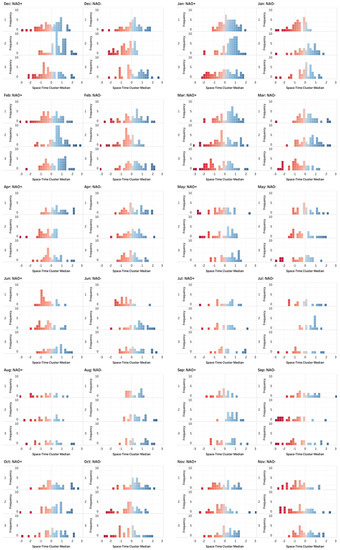 In the space-time clustering analysis, the NAO-rainfall response observed in the average monthly SPI-1 analysis (Figure 2 and Figure 3) comes through clearly. For example, the north-west/south-east spatial divide in winter rainfall response [10] can be seen in Figure 4 and Figure 5. During the winter months (DJF), the north-western areas experience the greatest change in rainfall under NAO+ and NAO− phases. In December, for example, the extremes of this response can be seen in NAO+ Cluster 2, which has a maximum cluster median SPI-1 value of 2 (extremely wet), and NAO− Cluster 2 which has a minimum cluster median SPI-1 value of −2.5 (extremely dry) (Figure 9 and Figure 10).