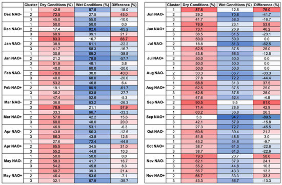 Even in areas that show relative consistency, variability in the cluster median SPI-1 values can still be observed (Figure 9). For example, in December, NAO− Cluster 2 in the north-western region (Figure 8), the minimum cluster median SPI-1 value is −2.5 which represents extremely dry conditions; however, the maximum is an SPI-1 value representing near-normal conditions (0.8). Whilst drier conditions are more likely in this cluster (72.5%), wet conditions were present for 27.5% of the time period analysed (Figure 11 and Figure 12). In February, NAO+ Cluster 2, similarly covering the north-western area, the maximum cluster median SPI-1 value is 1.9 (severely wet) and the IQR covers positive values only. Whilst wetter than average conditions were found in this cluster for the majority of the time period (80%), the cluster did experience relatively dry conditions for 20% of the time period (Figure 11 and Figure 12). These findings suggest that whilst the typical winter NAO responses can be observed in the north-western area, there is also some variability in both the magnitude of the NAO-rainfall response and the directionality (i.e., positive/wet, or negative/dry SPI-1 values).