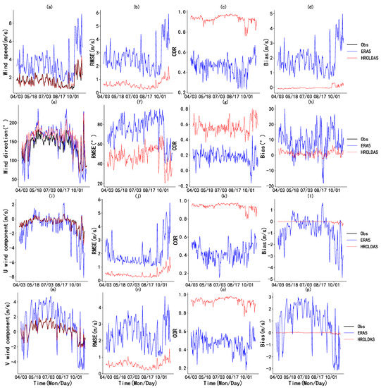 Figure 2d,h,l,p, show the time series diagrams of the daily average bias of wind speed, wind direction, U component, and V component, respectively. The bias of HRCLDAS from April to October was less than that of ERA5. For wind speed, the HRCLDAS data showed a negative bias from April to September, and the bias increased significantly in October, which showed a positive bias. For the wind direction, the bias of HRCLDAS and ERA5 was mostly positive, the bias of HRCLDAS was less than 6°, and the bias of ERA5 varied more dramatically over time, mostly between 0° and 30°. For the U and V components, the bias between HRCLDAS and the observation data were all approximately 0° without distinct variability. The U component of the ERA5 data showed mostly a negative bias, whereas the V component mostly showed a positive bias, and the bias of V component was larger than that of the U component.
