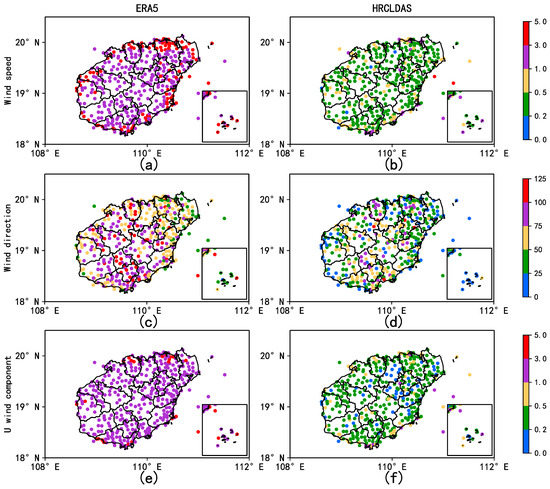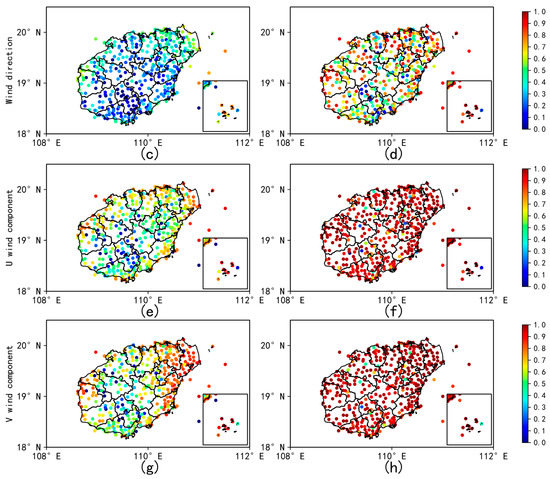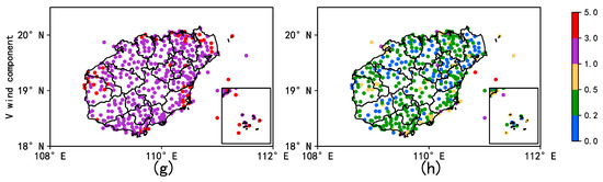 Figure 4 shows a comparison of the COR distribution of wind speed, wind direction, U component, and V component between ERA5 and HRCLDAS from April to October for each station of Hainan Island and the South China Sea. For wind speed, the stations with a higher ERA5 COR (Figure 4a) were mainly distributed in the east and west coastal areas of Hainan Island and the South China Sea, and the stations with a COR that was lower than 0.4 were mainly distributed in the central part of Hainan Island. Most of the HRCLDAS COR (Figure 4b) were between 0.95 and 1.0, and the stations with low correlation coefficients were mainly in the middle of Hainan Island. For the wind direction, the stations with better ERA5 COR (Figure 4c) were mainly distributed in the northeast of Hainan Island and the South China Sea, while the stations with a low COR were mainly in the middle and south of Hainan Island, and some of the stations had negative correlation. The COR of HRCLDAS wind direction (Figure 4d) was significantly higher than that of ERA5, the COR of most stations in the east and west of Hainan Island was more than 0.8, and the COR of the stations in the South China Sea was more than 0.9, and the stations with lower COR were mainly in the complex terrain areas, such as central Wuzhishan City. The stations with a higher COR for the U component of ERA5 (Figure 4e) were mainly distributed in the South China Sea and the coast of Hainan Island. The COR for the V component of ERA5 (Figure 4g) was significantly higher than that of the U component in the eastern part of Hainan Island. The station distribution of the COR for the U and V components of HRCLDAS (Figure 4f,h) was similar to that of wind speed, most of them were above 0.95, and the stations with a low COR appeared in Wuzhishan City.