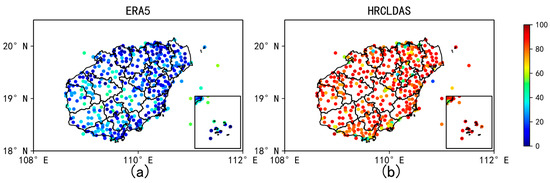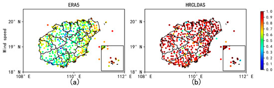 It can be concluded that the quality of the HRCLDAS and ERA5 wind speed products in the inland of Hainan Island was higher than that in the coastal areas of Hainan Island on the basis of the analysis of the site spatial distribution of the four wind factor evaluation indexes of HRCLDAS and ERA5. This conclusion is consistent with the performance of ERA5 for Guangdong Province in China [23]. The quality of the wind direction products in the coastal areas of Hainan Island was higher than that in the inland. For the wind speed, the RMSEs between the two datasets and the observations on the islands were both larger than on land, but the CORs were similar. For the wind direction, the RMSEs of HRCLDAS and ERA5 on the islands were both smaller than on land, and the CORs were higher on the lands than on land. In general, the data quality of HRCLDAS and ERA5 on the islands in the South China Sea was better than that on land. However, for both land and the islands in the South China Sea, the quality of HRCLDAS was better than that of ERA5, especially in the coastal areas of Hainan Island and the island stations near Sansha, where the quality of HRCLDAS was most significantly better than that of ERA5.