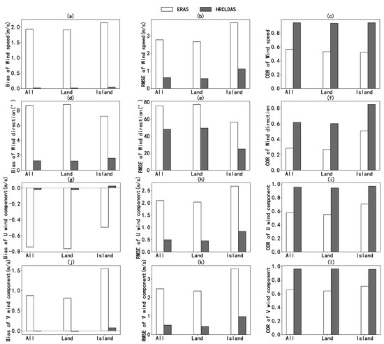In general, HRCLDAS wind products had a smaller bias, smaller RMSE, and larger COR for both land and sea islands when compared with ERA5. The quality of the HRCLDAS and ERA5 wind products for islands was slightly better than that for land.