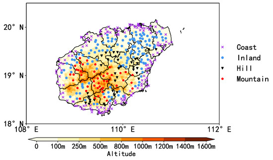 The landform has a strong influence on the wind, and different physical processes will affect the wind conditions of the stations under different landforms. Owing to the difference between land and sea, the stations that are close to the sea surface will be affected by the sea and land breeze; winds in flat inland areas are influenced by land surface processes and land–atmosphere interactions; the wind in mountainous and hilly areas may be affected by localized circulation that is driven by complex topography [19,29]. According to the above situation, the stations on Hainan Island are classified according to their geomorphological characteristics, distance from the station to the sea surface, and altitude (Figure 6): (1) coast stations, if located no further than 10 km from the sea; (2) inland stations, if located further than 10 km from the sea and situated on a plain or tableland; (3) hill stations, if located further than 10 km from the sea and with an altitude between 100 m and 500 m; and (4) mountain stations, if located further than 10 km from the sea and with an altitude that is greater than 500 m. Some previous studies have used similar classifications for wind [19,30].