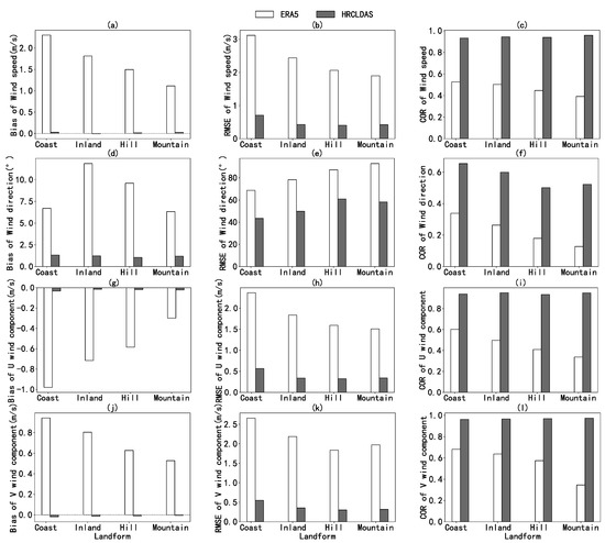 Figure 7g–l shows the bias, RMSE, and COR of the U and V wind components for the two datasets. From the bias diagram it can be seen that the U component of ERA5 and HRCLDAS had a negative deviation for all landforms, the V component deviation of ERA5 was positive, and the V component deviation of HRCLDAS was negative; the absolute value of the ERA5 bias decreased in the order of coastal, inland, hilly, and mountainous areas, and the bias of HRCLDAS was close to 0. The distribution of the other evaluation indicators of the U and V components of ERA5 and HRCLDAS was basically the same as the wind speed, and the quality of the U component of the two datasets was slightly lower than that of the V component.