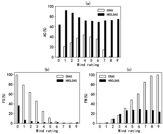 Figure 8b,c shows the strong rate and weak rate of each wind grade. The strong and weak rates of HRCLDAS were lower than the accuracy. The HRCLDAS wind was more likely to be stronger in Grades 0 and 1, and weaker in other wind grades, when compared with the observations. That means HRCLDAS was more likely to underestimate the wind speed. ERA5 had a relatively high strong rate when the wind grade was between 0 and 3, and the wind speed of ERA5 was significantly overestimated when compared with observations, especially for the Grade 0 wind, with its strong rate reaching 99.5%. The strong rate of ERA5 decreased with an increasing wind grade. When the wind grade was higher than Grade 5, the weak rate of ERA5 wind was higher than the strong rate and accuracy rate, which indicated that the wind speed was significantly underestimated. With the increase of the wind grade, the weak rate increased, and the highest weak rate was 100% when the wind grade was 9.