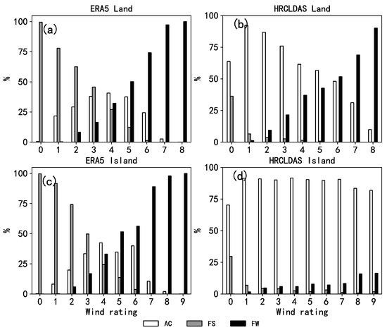 Figure 10b shows the accuracy of HRCLDAS for each grade of wind force on land. With the exception of Grade 0 wind, the accuracy of the wind grades decreased with the increasing wind grade, and the highest was 92.3% for Grade 1. The accuracy rates of Grade 1–5 wind were more than 56%, and those of Grade 6–8 wind were less than 50%. On land, the strong rates of wind above Grade 1 were low, the weak rates were higher than the strong rates, and the weak rates of Grade 6–8 wind were higher than the accuracy rates. This means that, over land, HRCLDAS underestimated high-grade wind speed, and the higher the wind grade, the more significant the underestimation. Figure 10d shows the accuracy rate of HRCLDAS for each grade of wind force on the islands. It can be seen that, except for Grade 0 wind, which had an accuracy rate of 70.3%, the accuracy rates of the wind grades were above 80%, with the lowest being 81.9% for Grade 9 and the highest being 91.6% for Grade 4. On the islands, the strong rates and weak rates were low, and the weak rates were slightly higher than the strong rates. It can be seen that the accuracy rate of HRCLDAS on the islands was significantly higher than that on land, especially for high-grade wind speed.