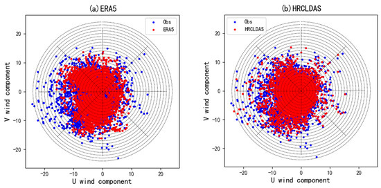 The frequency distribution of wind vector on 12–14 October 2020. (a) ERA5; (b) HRCLDAS.