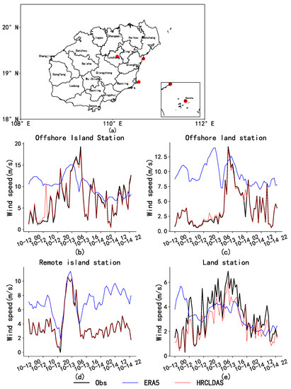 Several individual stations were selected to compare and analyze the variation of wind speed with time between the two datasets and the observations during the typhoon. Figure 12a depicts a location map of selected sites, which represent an offshore island station, an offshore land station, a remote island station, and a land station.