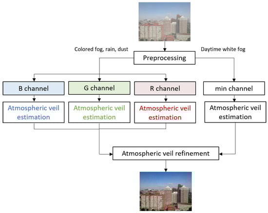 - Duminil, A.; Tarel, J.P.; Brémond, R. Single Image Atmospheric Veil Removal Using New Priors. In Proceedings of the 2021 IEEE International Conference on Image Processing (ICIP), Anchorage, AK, USA, 19–22 September 2021. [Google Scholar]