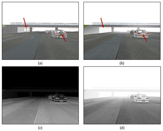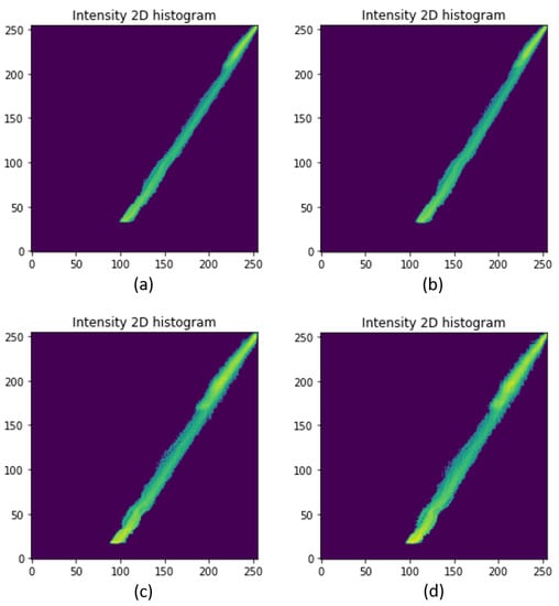 Histograms showing the link between pre-veil and veil pixel intensities (mean of fifty images from the FRIDA dataset []). (a) homogeneous fog and illumination, (b) homogeneous fog and heterogeneous illumination, (c) heterogeneous fog and homogeneous illumination, (d) heterogeneous fog and illumination.