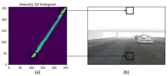 The usual way to compute the atmospheric veil from the pre-veil is to apply the parameter . To test the validity of this prior, we have to look at the link between the intensities in the true veil and in the pre-veil images. This can only be achieved with a synthetic image database, and, to achieve this, we used the generator of the FRIDA dataset []. In these synthetic images, the veil is computed using Koschmieder’s law from the scene depth map. Thus, the atmospheric veil map can be computed for each generated foggy image. An advantage is that it is possible to generate images with homogeneous or heterogeneous fog, and homogeneous or heterogeneous illumination. Figure 2 shows the histograms of fifty such foggy images, with the pre-veil image intensities on the horizontal axis, and the intensities of the ground truth atmospheric veil on the vertical axis. Figure 2 and Figure 3a show that the link between foggy pixel intensities and associated veil intensities is roughly affine. The intensity of the atmospheric veil is high in the sky region, and it is low in the ground region that is closer to the camera. Since this variation is affine, it cannot be modeled well with a constant parameter such as . A function would be more relevant.
