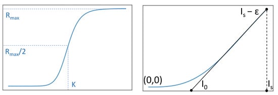 , K, and n are the parameters of the Naka–Rushton function, whereas the parameters of the modulation function f are , , and . In the previous section, K was set to . Following constraint 4 in Section 3.3, is set to . Thus, . The slope at is set to a. This slope in the Naka–Rushton function being (obtained by deriving the Naka–Rushton function), we have . It follows that . The parameter a was calculated as the slope between the points of coordinates (, 0) and (, ) (see the right image in Figure 4).