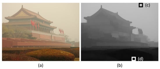 Ancuti et al. [,] proposed a fusion-based approach to estimate the atmospheric veil. It combines several feature images and weight maps derived from the original input image. The prior lies implicit in the way the fusion is achieved. Wang et al. [] proposed a method based on a so-called color attenuation prior, where the atmospheric veil is estimated using a linear combination of features extracted locally in the input foggy image.