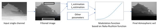 Atmospheric veil estimation from the morphologically filtered pre-veil using Naka–Rushton as a modulation function.