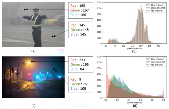 RGB values comparison: (a) daylight white fog image from the RESIDE dataset [], (b) histogram of the daylight white fog image, (c) colored fog image (reprinted with permission from ref. []. Copyright 2021 Mark Broyer), (d) histogram of the colored fog image. This figure shows the RGB values of the pixel in the center of the black squares. Pixel intensity is between 0 and 255.