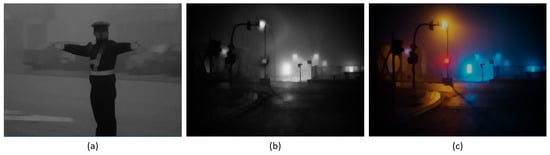 Visibility restoration of outdoor images is a well-known problem in both computer vision applications and digital photography, particularly in adverse weather conditions such as fog, haze, rain, and snow. Such weather conditions cause visual artifacts in the images such as loss of contrast and color shift, which contributes to reducing scene visibility. The lack of visibility can be detrimental for the performance of automated systems based on image segmentation [] and object detection [], and thus requires visibility restoration as a pre-processing []. With fog or haze, contrast reduction is caused by the atmospheric veil. With rain or snow, it is caused by the occlusion of the distant background by raindrops or snowflakes.