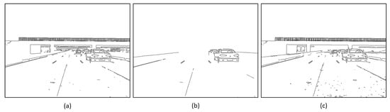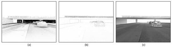 In addition to these metrics, an edge-based criterion was considered. It consists of applying an edge filter, such as the Canny edge detector [], on both the ground truth and the restored images, and to compare the two binary edge maps in order to assess the benefit of restoration in terms of edge visibility. This criteria may be useful, for instance, to assess restoration for detection algorithms for onboard cameras. Figure 12 shows that edge maps obtained with the Canny filter on the same scene without fog, with fog, and after fog removal.
