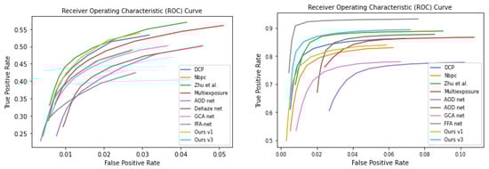ROC curves comparison for different algorithms. (Left): ROC curves obtained from fifty images of the FRIDA dataset. (Right): ROC curve from fifty images of the SOTS dataset. The max threshold of the Canny filter is set to 180. The legend Multiexposure corresponds to Zhu et al.’s [] method.