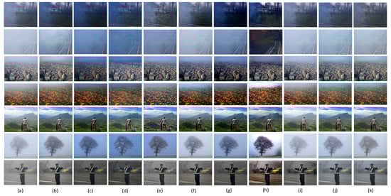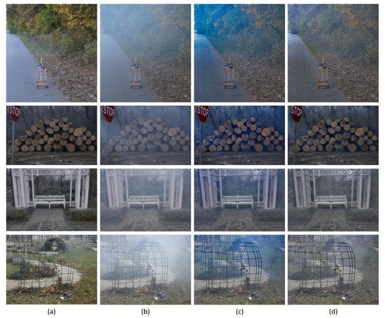 FRIDA dataset: http://perso.lcpc.fr/tarel.jean-philippe/bdd/frida.html, accessed on 15 June 2021; RESIDE/SOTS dataset: https://sites.google.com/view/reside-dehaze-datasets/reside-v0, accessed on 15 June 2021; O-HAZE dataset: https://data.vision.ee.ethz.ch/cvl/ntire18//o-haze/, accessed on 13 May 2020; NTIRE20 dataset: https://data.vision.ee.ethz.ch/cvl/ntire20/, accessed on 4 June 2020; [] code: http://perso.lcpc.fr/tarel.jean-philippe/, accessed on 30 October 2020; [] code: https://github.com/sjtrny/Dark-Channel-Haze-Removal, accessed on 24 July 2020; [] code: https://github.com/Lilin2015/Author—Single-Image-Dehazing-based-on-Dark-Channel-Prior-and-Energy-Minimization, accessed on 17 December 2020; [] code: https://github.com/MayankSingal/PyTorch-Image-Dehazing, accessed on 30 June 2020; [] code: https://github.com/caibolun/DehazeNet, accessed on 3 July 2020; [] code: https://github.com/cddlyf/GCANet, accessed on 8 December 2020; [] code: https://github.com/yu-li/yu-li.github.io/blob/master/index.html, accessed on 7 July 2020; [] code: https://github.com/yuteng/nighttime-dehazing, accessed on 7 July 2020; [] code: https://github.com/zhilin007/FFA-Net, accessed on 11 May 2021; [] code: https://github.com/zhiqinzhu123/Fast-multi-exposure-fusion-for-image-dehazing, accessed on 11 May 2021.