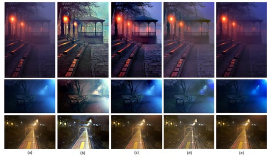 - Ancuti, C.; Ancuti, C.O.; De Vleeschouwer, C.; Bovik, A.C. Night-time dehazing by fusion. In Proceedings of the 2016 IEEE International Conference on Image Processing (ICIP), Phoenix, AZ, USA, 25–28 September 2016; pp. 2256–2260. [Google Scholar] [CrossRef]