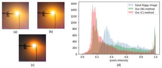 Figure 17 shows a comparison between the white version (W) and the colored version (C) of our algorithm of an image representing a halo with an orange fog. Figure 17b shows that W seems to accentuate the glow effect and does not remove the colored fog. In contrast, C (Figure 17c) succeeds in attenuating the halo effect and the orange shift. The histogram in Figure 17d shows the intensity distribution of the image. The blue part corresponds to the input foggy image. It is evenly distributed over the intensity range [0.2, 1.0], which represents the foggy part of the image. Therefore, ideally, the histogram of the restored image should peak towards the left side of the histogram.