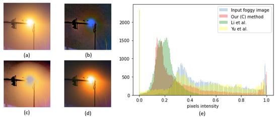 Comparison on a glow patch: (a) foggy image, (b) Li et al. [], (c) Yu et al. [], (d) restored image with the color version of our algorithm, (e) histogram of the intensity of each glow patch (glow images are adapted with permission from ref. []. Copyright 2021 Mark Broyer).
