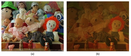 Image from the Middlebury dataset []: (a) input image, (b) nighttime synthetic image []. In the context of synthetic images, the size of the opening filter is set to (30,30) instead of (10,10).
