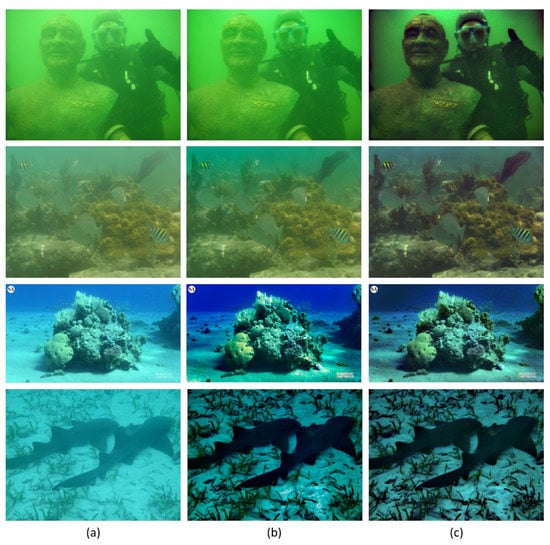 Underwater images from []: (a) input images, (b) images restored with our White fog algorithm (W), (c) images restored with the color version of our algorithm (C).