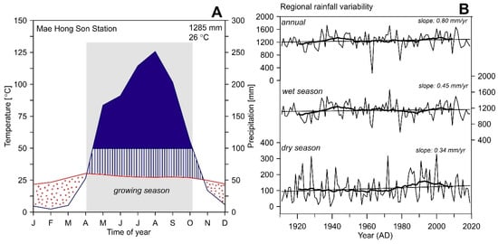 (A) Walter and Lieth climate diagram (Walter and Lieth, 1967) monthly rainfall totals and mean temperatures between AD 1951 and 2019 for the MHS (Thai Meteorological Department, 2019). The dark-blue area and blue lines represent rainfall and temperatures, respectively. Values on the left axis of the diagrams are average maximum and minimum temperatures of the warmest and the coldest months, respectively, whereas values on the upper right corner show annual average temperature and total precipitation. Areas shaded in black and gray indicate the moist and the arid periods. The growing season (grey shadow) of teak extends approximately from April to October. (B) MHS rainfall for the rainy season (May to October), and dry season (November to April), and annual sum (1951–2019), 20-year cubic-smoothing splines (thick black line) and linear trends lines (black line) show long-term fluctuations and trends.
