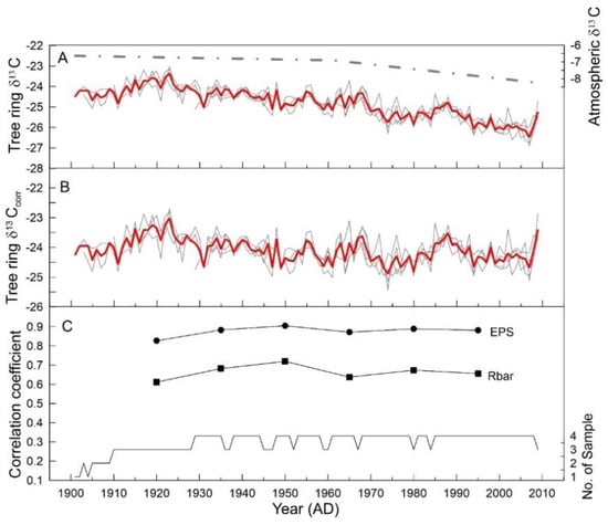 (A) Average δ13CTR from four trees and δ13C in the atmosphere; (B) δ13Ccorr series after removing the long-term decreasing trend from δ13C in the atmosphere; (C) the expressed population signal (EPS) and inter-series correlation (Rbar) statistics of the δ13CTR chronology.