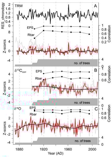 The inter-correlation among each δ13CTR series declined to be lower than the correlation among the original δ13C series (Figure 3B). The moving correlations, using 30-year windows with a 15-year overlap in EPS and Rbar of the δ13CTR chronology, varied between 0.82 and 0.91, and 0.61 and 0.72, respectively (Figure 3C).