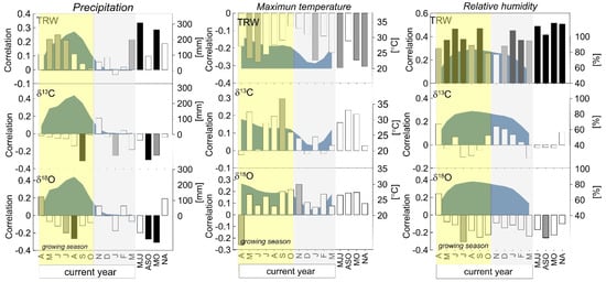 Correlation between the tree-ring chronology (TRW) (top panel), tree-ring δ13C chronology (middle) and tree-ring δ18O chronology (lower panel) with MHS meteorological station data (precipitation, maximum temperature and relative humidity). The black bars indicate significance at p < 0.01, the gray bars are significant at p < 0.05, and the white bar graph indicates non-significant correlation values. The yellow frame highlights the growing season. The blue areas indicate the values of precipitation (mm), maximum temperature (°C), or relative humidity (%) in the different columns.