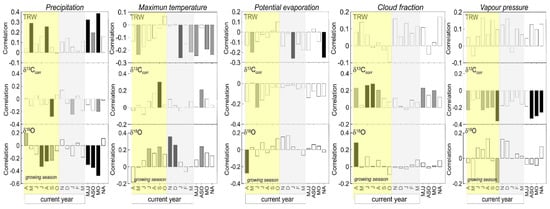 Correlation between the tree-ring chronology (TRW) (top panel), tree-ring δ13C chronology (middle) and tree-ring δ18O chronology (lower panel) with CRU TS4.04 climate data (precipitation, maximum temperature, potential evaporation, cloud fraction, and vapor pressure). The black bars indicate significance at p < 0.01, the gray bars are significant at p < 0.05, and the white bar graph indicates non-significant correlation values. The yellow frame indicates the growing season.