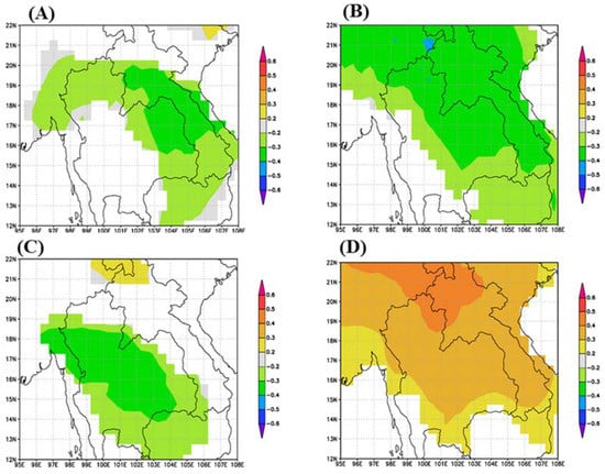 The relationship between δ18O in tree-ring cellulose and climate factors in this study is consistent with previous studies of teak in other regions of Thailand [16]. It exhibits an inverse relationship with the MHS rainfall (MO, r = −0.309, p < 0.002), and CRU TS4.04 rainfall (MO, r = −0.470, p < 0.0001). This study found no correlation between δ18OTR and δ18Orain from Bangkok Station. This could be due to the distance from Bangkok to Mae Hong Son, about more than 700 km, and the moisture source of the rainfall at Bangkok and Mae Hong Son is different. Researches have confirmed that the source of moisture or rainfall at Mae Hong Son during the first half of the rainy season (MJJ) was influenced by the Indian Ocean, whereas the moisture source in the second half of the rainy season (ASO) was influenced by the South China Sea [15,48,49]. The δ18OTR was significantly positively correlated with the Niño3.4, Niño4 (data not shown), which is consistent with previous studies [44,50,51].