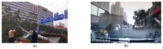 On 5 May 2017, a tree was blown down by intense wind and hit a car (a) https://news.qq.com/a/20170505/025960.htm (accessed on 5 May 2017); a billboard was blown down and injured a pedestrian (b) (https://v.qq.com/x/page/n0500nddjni.html? (accessed on 5 May 2017).