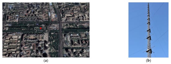 The capital of China, Beijing, lies in the northeast part of the country, with a total area of 16,410.54 square kilometers. The local wind system is dominated by the monsoon-influenced humid continental climate, characterized by hot, humid summers due to the East Asian monsoon, and by cold, windy, dry winters that reflect the influence of the vast Siberian anticyclone. Besides this, thunderstorms also occur frequently, and the average annual number of thunderstorm days in the Beijing area is 35.6. The peak wind speeds produced by thunderstorm events are sometimes relatively stronger than those produced by monsoon winds, while the duration of the thunderstorm outflows is much shorter and the 10-min mean wind speeds are relatively smaller [28]. Therefore, thunderstorm winds are also dominant for the structural design, and their main characteristics related to the wind loading of structures should be considered separately [29]. The Beijing Meteorological Tower, as shown in Figure 2a, located 2.7 km north of Deshengmen, 1 km away from the third ring road of Beijing city, was set up in 1978 for basic scientific research, with a height of 325 m. When it was built, the terrain was flat, with numerous low-rise buildings around the tower. With the rapid development of Beijing, the tower site is now surrounded by some tall buildings with heights between 70 m and 90 m, nearly 500 m away towards the north. There are a few low-rise houses and trees to the east of the tower. Some buildings, including several 60 m high buildings, are about 300 m away from the tower in the southern direction. The area on the west side of the tower is covered by a mixture of trees, low-rise residential houses with the height of about 7 m to 25 m, and roughly 40 m-high buildings [11,30]. The average height of the buildings is about 19.1 m in the range of 4 km × 4 km around the tower, and it is 18.3 m in the range of 20 km × 20 km. The object characteristic parameters are shown in Table 1. According to the Chinese National Load Code [31], the site around the tower can be regarded as terrain C (urban area).