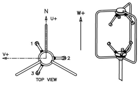Tri-axial ultrasonic anemometer and the direction of the three instantaneous wind speed components (GILL WindMaster Pro).
